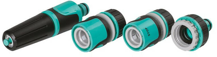 Sugárcső készlet A FESTA-tól. Ez a készlet minden olyan elemet tartalmaz amely szükséges lehet ahoz, hogy magunknak készíthessük el, egyedileg a kívánt hosszúságú locsolótömlőnket, majd rácsatlakozhassunk vele a kerti csapra, és magunk kezdhessük meg vele a locsolást. A készlet tartalmaz egy menetes csapcsatlakozót, két tömlővéget, amit valójában gyorscsatlakozó szerűen a csapcsatlakozóra, illetve a locsolófejre csatlakoztathatunk.