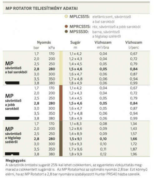 HU MP Rotátor szórófej: Egyenletes öntözés, víztakarékos megoldás ? Ez a HU MP Rotátor szórófej bal sarokba való kivitel tökéletes megoldás a hatékony és egyenletes öntözéshez. Kiváló minőségű anyagokból készült, hosszú élettartamú és könnyen karbantartható. Kiemelt előnyök:Rendkívül alacsony öntözési intenzitás: Kb. 10 mm/óra, így a vízfogyasztás minimálisra csökken. ? Egyenletes öntözés: Egészséges növénynövekedést biztosít. ? Kettős kiemelkedés: Megvédi a fúvókát a szennyeződésektől. ?️ Szélálló többsugaras öntözés: Megakadályozza a ködképződést. ? Cserélhető szűrő: Megakadályozza a fúvóka eltömődését. ⚙️ Színjelölés: Könnyű beazonosíthatóság. Műszaki adatok:Nyomás (bar) Nyomás (kPa) Sugár (m) Vizhozam (m³/óra) Vizhozam (l/perc)1,7 170 1,1 x 4,2 0,04 0,672, 0 200 1,2 x 4,3 0,04 0,722, 5 250 1,4 x 4,5 0,05 0,792, 8 280 1,5 x 4,6 0,05 0,843, 0 300 1,6 x 4,7 0,06 0,873, 5 350 1,7 x 4,8 0,06 0,943, 8 380 1,8 x 4,9 0,06 0,99Megjegyzés: A szórástávolság 25%-kal csökkenthető. Ajánlott nyomástartomány: 2,8 bar (280 kPa).